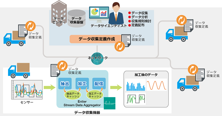 「Entier Stream Data Aggregator」は、定義した規則に従いデータ収集機器上でデータの抽出と加工を行います。さらに、システム稼働後に定義を更新することも可能です。企業はこれにより、データの活用目的に応じた精度の高いデータを収集できるとともに、通信量やサーバへの負荷を削減することが可能となります。