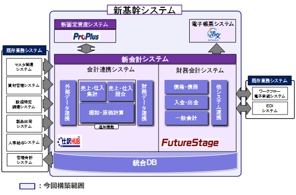 新基幹システムは、日立ソリューションズが構築した会計・固定資産管理システムと、資材管理、・設備特定調達・製品出荷などの既存業務システムを連携することで、会計業務の省力化や決算の短期化への対応が可能となりました。