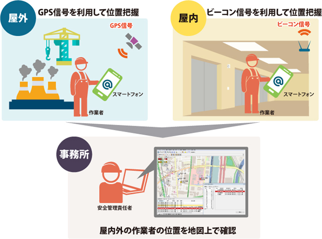本システムは、作業員が携帯するスマートフォンがBluetoothビーコンの電波強度で位置を推定し、サーバーに位置情報を送信するものです。また、安全管理者が事前に設定した危険区域に作業員が進入した場合、スマートフォンにアラームを発信することも可能です。