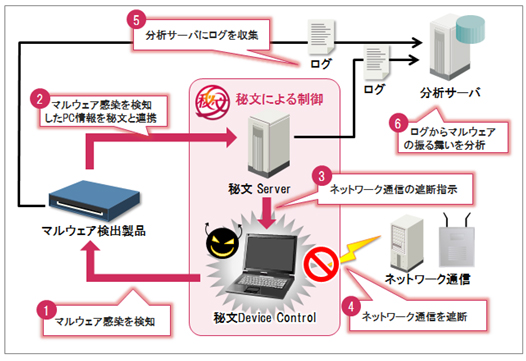 図2:「秘文 Device Control」のマルウェア検出製品、分析サーバー連携イメージ