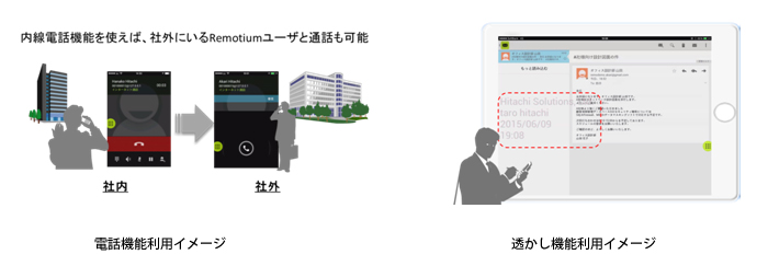 このたび「Remotium」にスピーカーやマイクを新たにサポートしたことにより、「Remotium」内のアプリケーションを利用したユーザー同士の内線電話による通話が可能となりました。これにより、セキュアな環境において相手の場所を社内外問わず電話をかけられるだけでなく、個人所有のスマートデバイスを業務用の内線電話として利用できることで、業務効率の向上を支援し、また通話コストの削減を実現します。また、「Remotium」上で動作しているアプリケーション画面にユーザー名や時刻などの「透かし」を強制的に挿入することで、画面スクリーンショットや写真撮影による不正な業務情報の持ち出しに対するユーザーの心理的な抵抗を作り、情報漏洩の抑止を図ります。