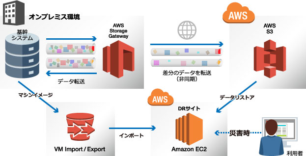 さらに、Amazon EC2への基幹システムDRサイトの構築では、オンプレミス環境で稼働している、AWS上の適用範囲を越えた古いバージョンのソフトウェアを、VM Import/Export機能を利用することでAWS上へ移行することができました。