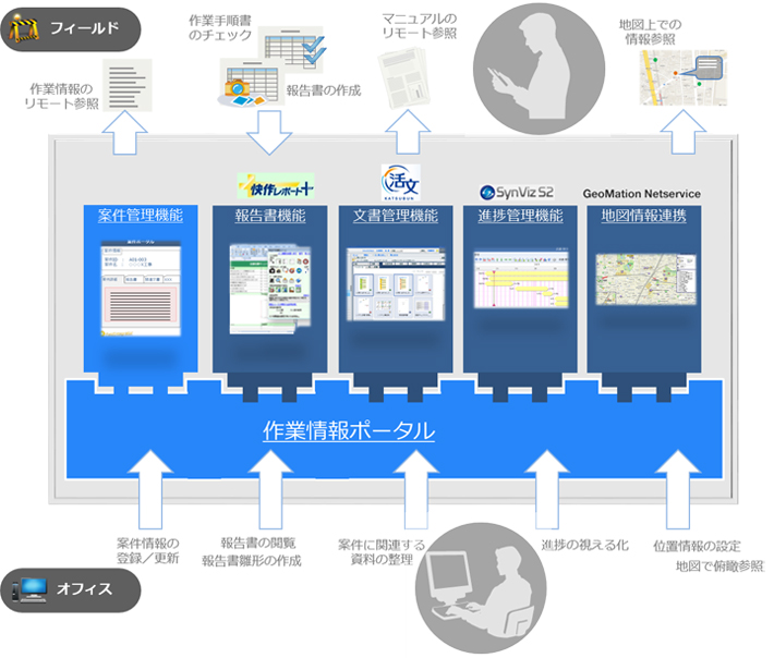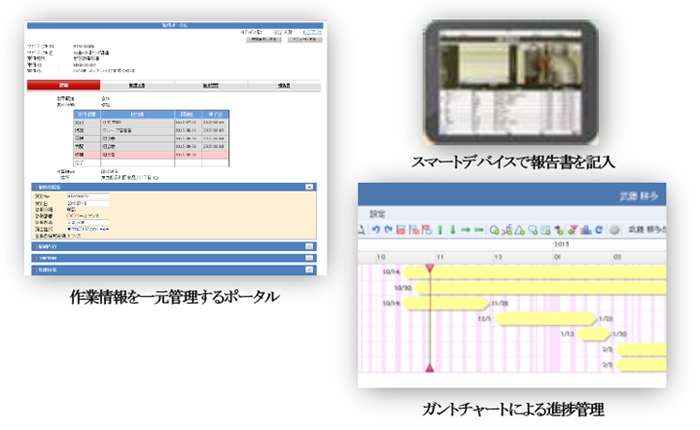 本システムは、作業案件の契約情報、作業計画とその進捗状況、さらには作業報告書や関連する図面などの案件にかかわる情報を一元管理し、現場やオフィスの作業者に対しタイムリーに情報提供するものです。