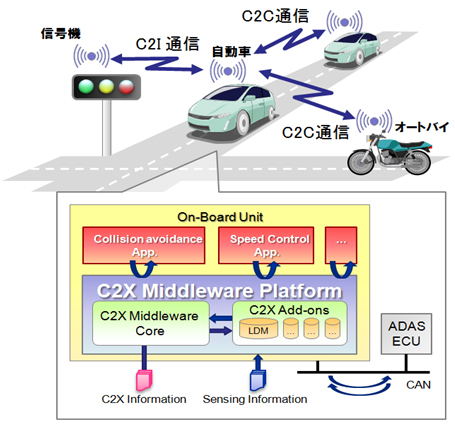 「C2X Middleware Platform」は、自動車の位置、速度、加速度、制御情報などの車両情報や、周辺の信号、標識、路側センサーなどから得た道路インフラの情報を、無線通信によって車両間で相互に交換し、またその情報を運転支援のためのアプリケーションに提供する通信ミドルウェア基盤です。