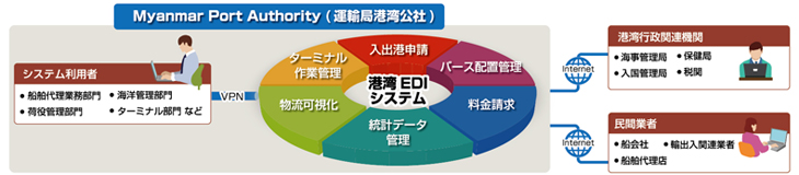 ミャンマー国運輸局港湾公社(MPA)が本システムを提供し、海事管理局などの港湾行政関連機関や船会社などの民間事業者が本システムを利用します。