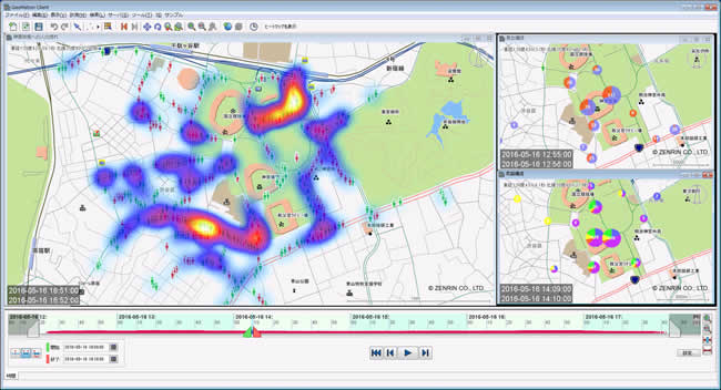人や車の流れなどのGPS(全地球測位システム)情報を分析・集約し、ヒートマップやグラフ、等値線などで地図上にリアルタイムに表示し、エリアマーケティングなどで活用できます。ビッグデータ対応においては、従来、日立製作所の高速データアクセス基盤「Hitachi Advanced Data Binderプラットフォーム」との連携やクラスタリング構成で、システムの性能や信頼性を確保しています。