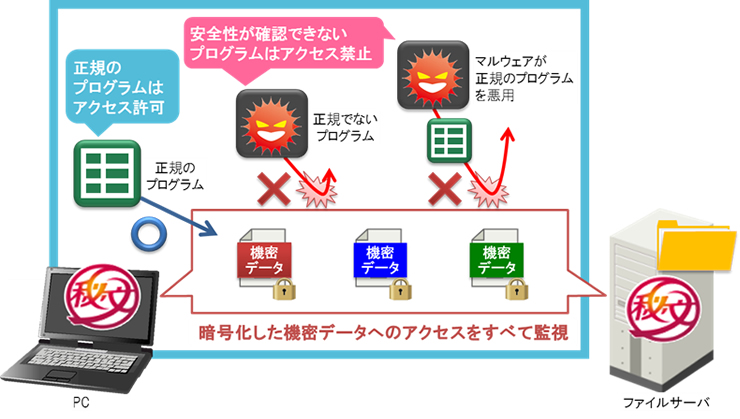 これまで、正規のPC利用者だけに機密データへのアクセスを許可し、そうでないPC利用者にはアクセスを禁止してきましたが、「秘文 Data Encryption」最新版では、PC利用者だけでなく、プログラムに対しても、正規のプログラムかそうでないかの識別を行うことで、機密データへのアクセスを制御します。