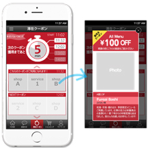 来店者が店舗から500m圏内に入ると、スマホアプリにお得なクーポン一覧がプッシュ通知され、滞在時間のカウントが始まります。15分、30分など、設定された間隔で、各クーポンは利用可能になり、スマホアプリで表示されます。来店者は、これらのお得な情報によって、より長く店内にとどまり、買い物を楽しむことができ、より多くの商品の購買が期待できます。