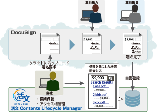 株式会社日立ソリューションズ(本社:東京都品川区、取締役社長:柴原 節男/以下、日立ソリューションズ)は、従来、紙文書で行っていた承認や決裁などの業務をデジタル化する、米国DocuSign, Inc.のクラウドサービス「DocuSign(ドキュサイン)」と、日立ソリューションズのビジネスコンテンツの自在な活用を支援する「活文」を連携し、契約業務の効率向上を図る「電子契約ソリューション」を5月31日から販売開始します。