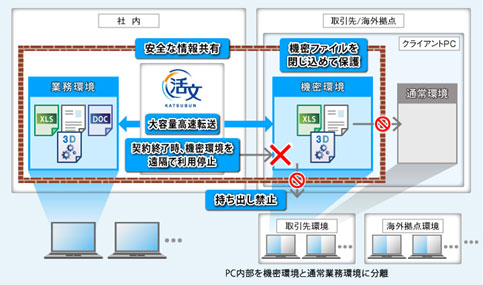 本ソリューションでは、クライアントPC内に、情報を持ち出させない機密環境を用意し、「活文」の情報共有基盤と連携することで、安全で効率的な協調設計環境を実現します。