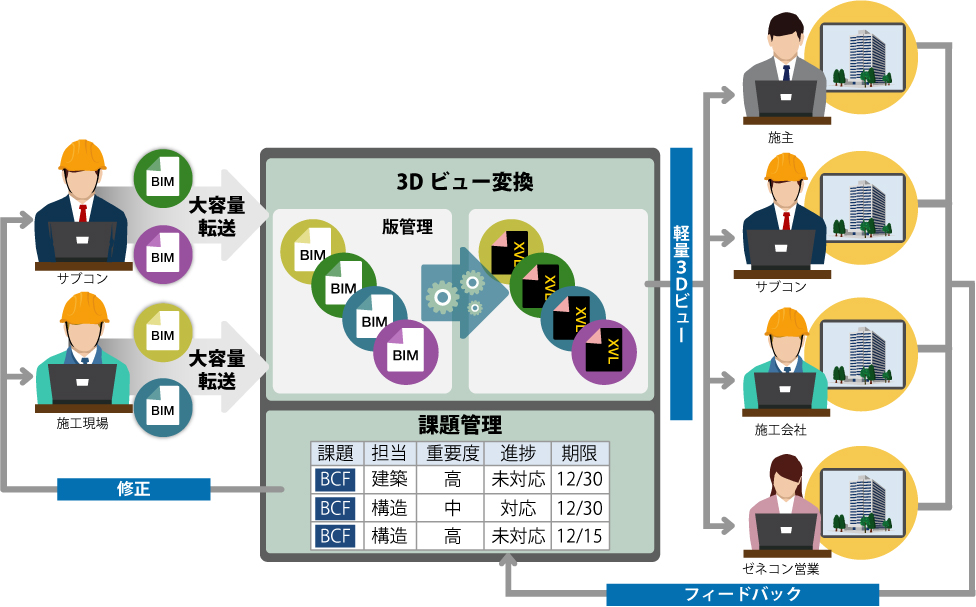 本ソリューションは、総合建設業者(以下、ゼネコン)や、建築工事や電気設備工事、空調・衛生工事などの下請建設業者(以下、サブコン)の設計者が個別に作成したBIMデータを、大容量高速転送技術*2で転送して一元管理することで、関係者と迅速に共有できます。