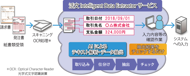 本サービスは、2017年7月から販売しているパッケージ製品「活文 Intelligent Data Extractor」の機能をクラウドで提供するものです。請求書や発注書など、紙書類に記載されている内容から、AIを活用して必要なデータを自動抽出することで、データ登録作業の効率化と精度向上を図ることができます。