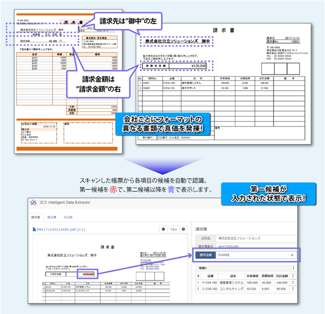 紙書類に記載されている文字情報から、システムなどへの入力が必要となる対象を、データ抽出設定画面から、「請求書で御中の左にあるのが請求先」(図参照)といった簡単な定義を行うことで、AIの文字認識機能を活用した自動抽出をクラウドで提供します。