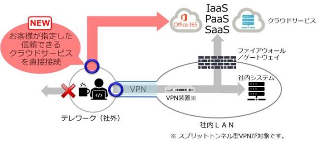 インターネットブレイクアウトでは、お客様が指定した信頼できるクラウドサービスだけモバイルPCから直接インターネットに接続させ、それ以外の通信は強制的にVPN経由で社内ネットワークに接続させます。これにより、セキュアなテレワーク環境と、快適なクラウドサービスの利用を実現します。2020年4月28日