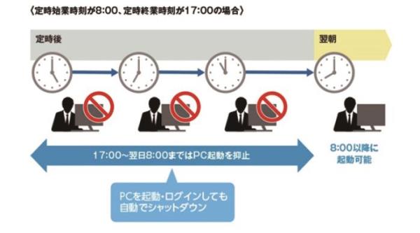 1.特定の時刻以降は翌朝までPCを利用抑止することで、時間外労働を抑制