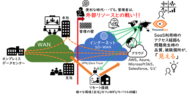 図1:ThousandEyesで社内外ネットワークとクラウドを可視化するイメージ