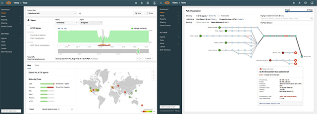 図2:「ThousandEyes」の時間や地図、ネットワーク経路情報を可視化する画面