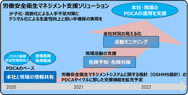 本ソリューションは、厚生労働省の「労働安全衛生マネジメントシステムに関する指針(OSHMS指針)*1」やISO45001*2を中心に厳格化する労働安全衛生の法規制・コンプライアンスへの対応において、労働安全衛生に関する計画の作成から実施、評価および改善までのPDCAの運用を支援する情報共有システムを提供します。