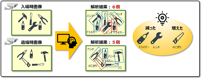 本ソフトウェアでは、作業員が作業現場の入場時に持ち込んだ物品の画像を退場時に持ち出す物品の画像と比較することで、置き忘れや、余分な持ち出しなどのチェックを自動化できます。これにより、これまで1個ずつ目視でチェックしていた物品管理作業の自動化が可能になり、現場管理者の業務負担や作業員の入退場待ち時間を低減できます。