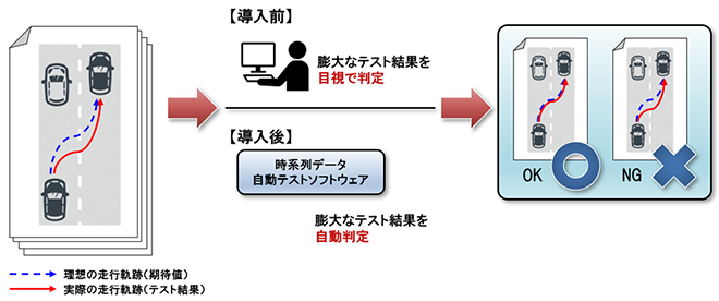 これにより、繰り返し行われる自動運転車両の走行軌跡や車両挙動などのシミュレーションテストにおいて、車載向け電子制御機器の開発者が目視で行っていた合否判定の作業が自動化され、不要になります。