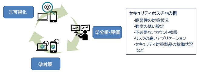 秘文のポスチャマネジメントのサイクルは、「可視化」「分析・評価」「対策」の3つのステップで構成されています。「秘文 統合エンドポイント管理サービス」の今回提供する機能は、オフィスワークとテレワークのセキュリティリスクを「可視化」するものです。