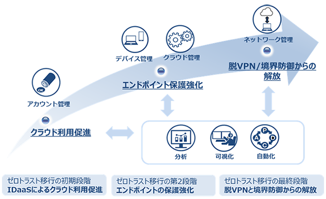 日立ソリューションズでは、境界防御モデルからゼロトラストモデルへ移行するためのベストプラクティスとして、以下のような段階的な移行シナリオを描き、ソリューションを提供していきます。