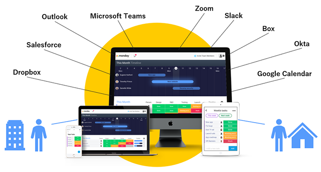 「monday.com」は、マイクロソフト社の「Microsoft 365」やセールスフォースドットコム社の「Salesforce」、オクタ社の「Okta Identity Cloud」などの主要なクラウドサービスと標準で連携しており、1つのプラットフォーム上で業務の状況や関連する情報を統合管理できます。