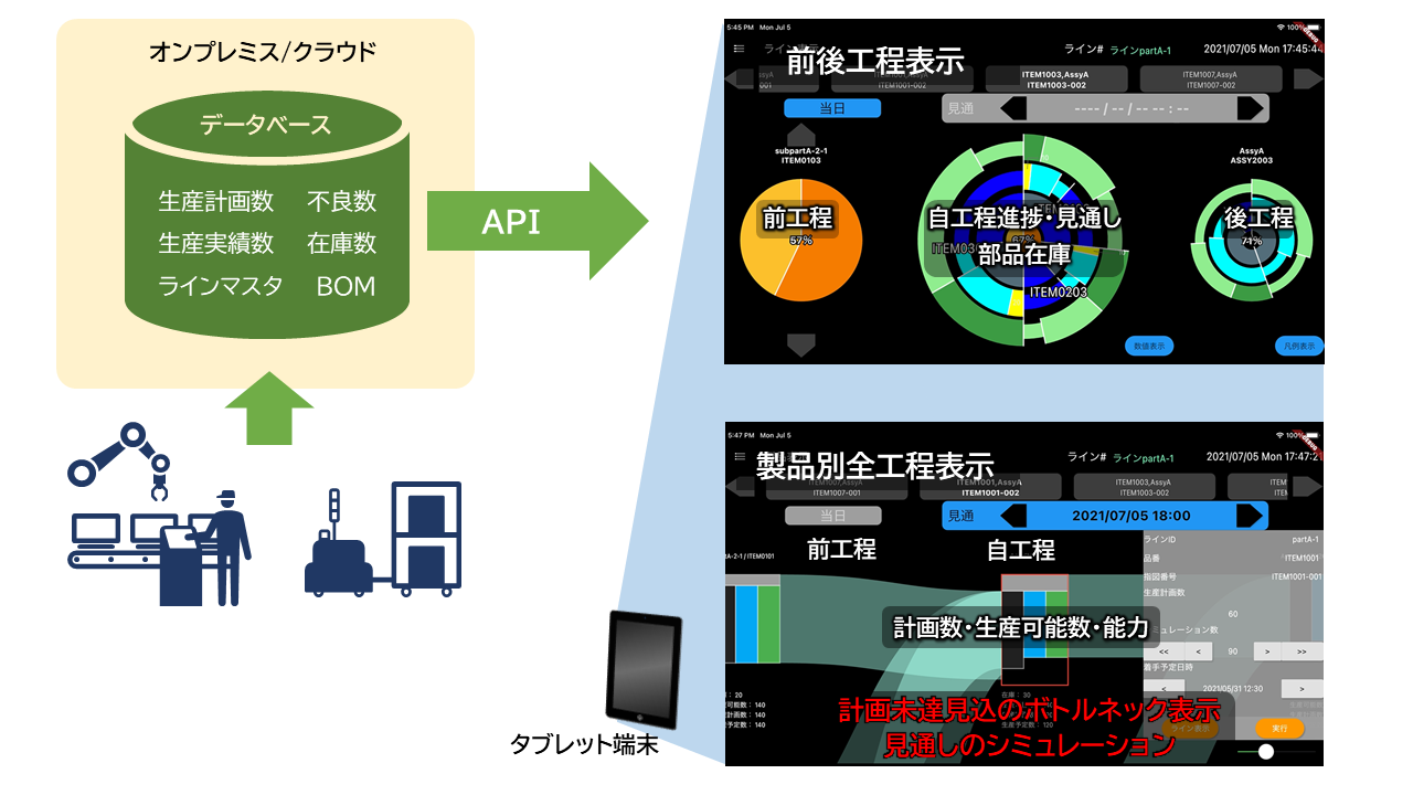 本システムは、データベースに登録された生産計画や実績、在庫数、BOMなど*1を基に、製造現場の管理者向けに、前工程と自工程、後工程の生産進捗、不良数、在庫などの生産状況が一目でわかるグラフに可視化します。前工程で製造される部品の納期遅延や欠品、突発の生産量増加などを想定し、自工程への影響をシミュレーションすることも可能です。さらに、製造工程全体において、目標未達成に影響するボトルネックも可視化されます。専用のデータベースを持ち、既存システムと連携して収集する構成となっており、既存システムを改編しなくてもデータ連携のみで導入できます。