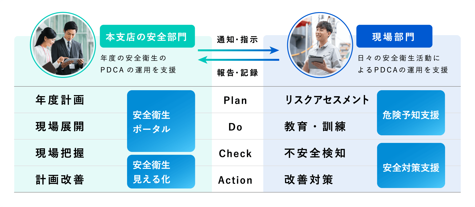 この度のサービス提供に伴い、「労働安全衛生マネジメント支援ソリューション」のラインアップに、従来の現場支援であるPlan(リスクアセスメント)、Do(危険予知訓練)に加え、Check・Action(不安全検知:「災害報告」、現場把握・計画改善:「災害発生分析」)を拡充することで、安全衛生活動の質向上や効率化を支援するソリューションを提供していきます。