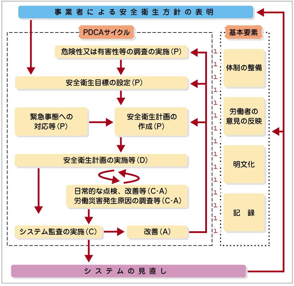 労働安全衛生マネジメントシステムとは、事業場における安全衛生水準の向上を図ることを目的として、事業者が一連の過程を定めて自主的に活動を行うもの。