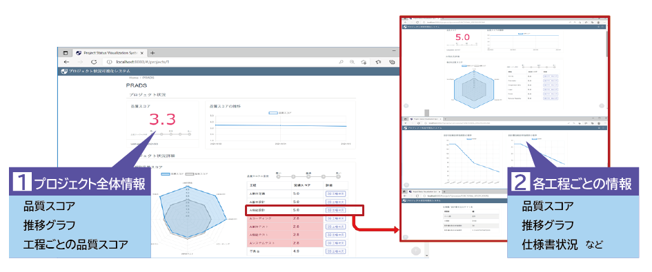 1.プロジェクトの品質をスコアリングし、工程ごとの品質や不具合発生の傾向、進捗状況を可視化