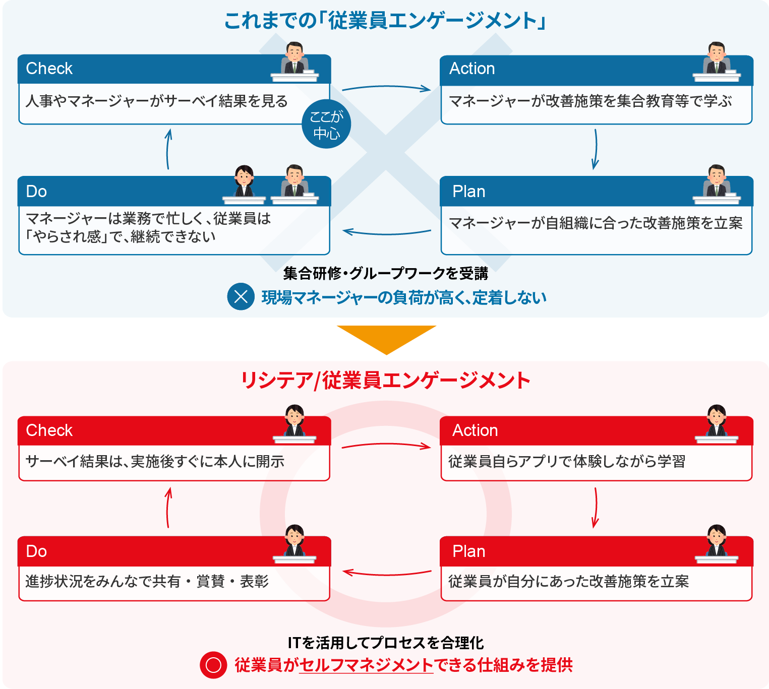 従来の従業員エンゲージメント*3向上施策は、職場の管理者に改善策を任せられているため、その業務負担が障壁となり、継続的な取り組みになりにくいという課題がありました。