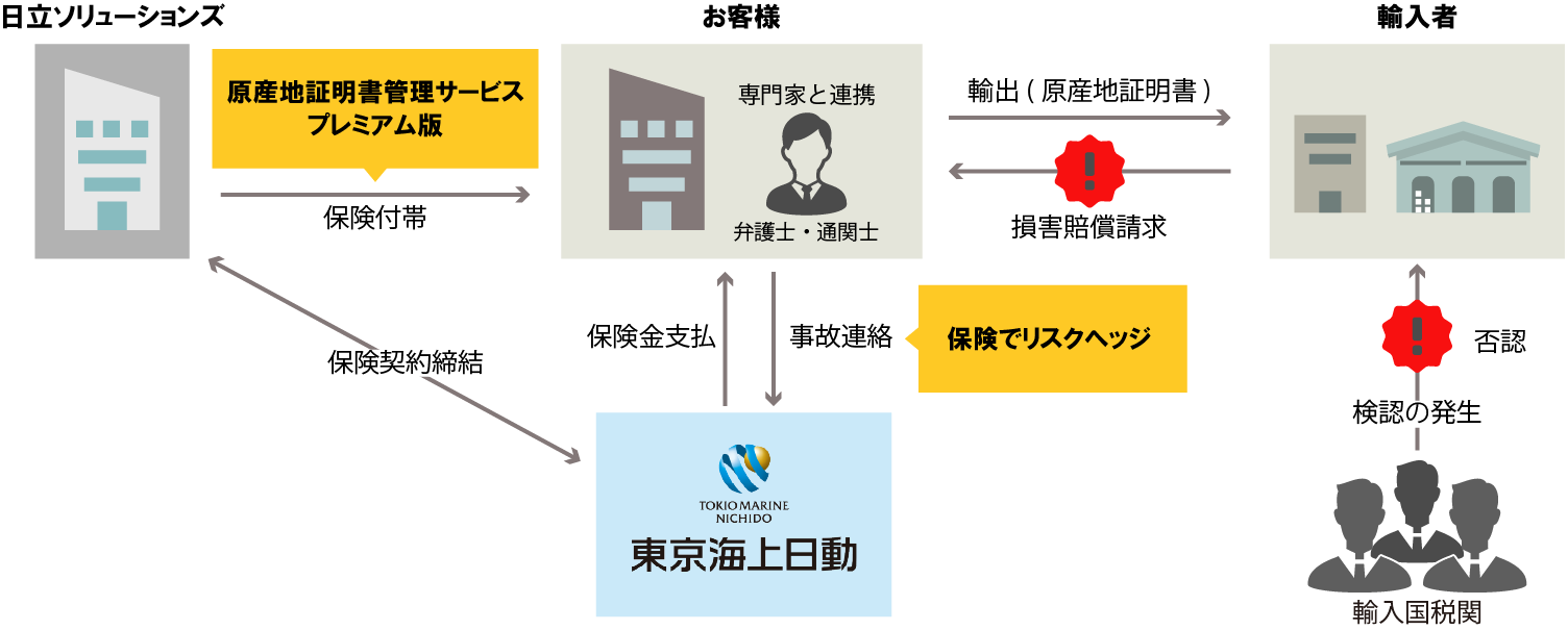 このたび東京海上日動と日立ソリューションズは両社のノウハウを生かし、書類作成時の不備により、原産地証明書が無効になった場合の賠償額を補償する商品付帯保険を開発し、「原産地証明書管理サービス プレミアム版」にて提供することになりました。これにより、企業が安心してFTAを活用できる環境づくりに貢献していきます。