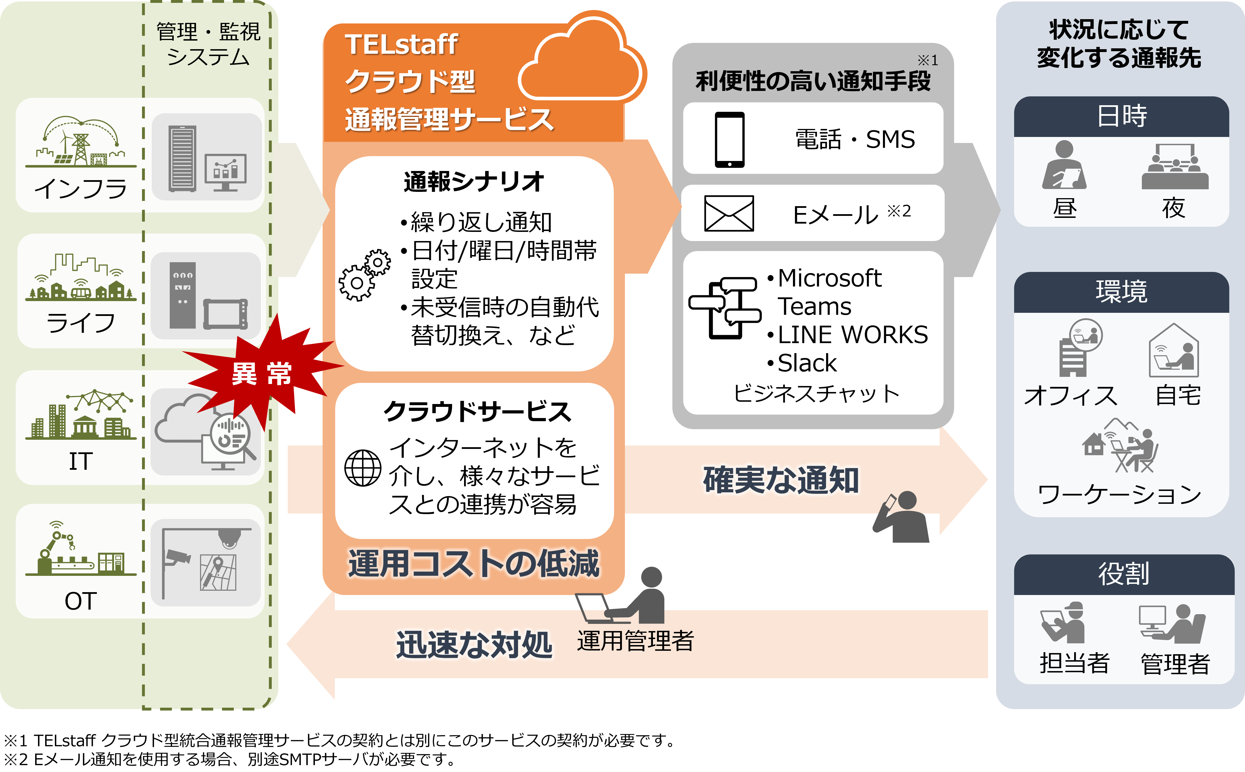 本サービスは、各種監視ツール・サービスと連携し、複数の通知方法(電話やメール、SMS(ショートメッセージサービス)、Microsoft TeamsやLINE WORKS、Slackなどのチャット )を組み合わせて、機器やセンサー、システムなどで検知された異常を担当者に通知するものです。担当者が情報の確認処理を行うまで通知を繰り返したり、日付や曜日、時間帯などに応じて通知先担当者や通知手段を変えたりするなど、通知の確実性を高めるための細かな設定が可能です。