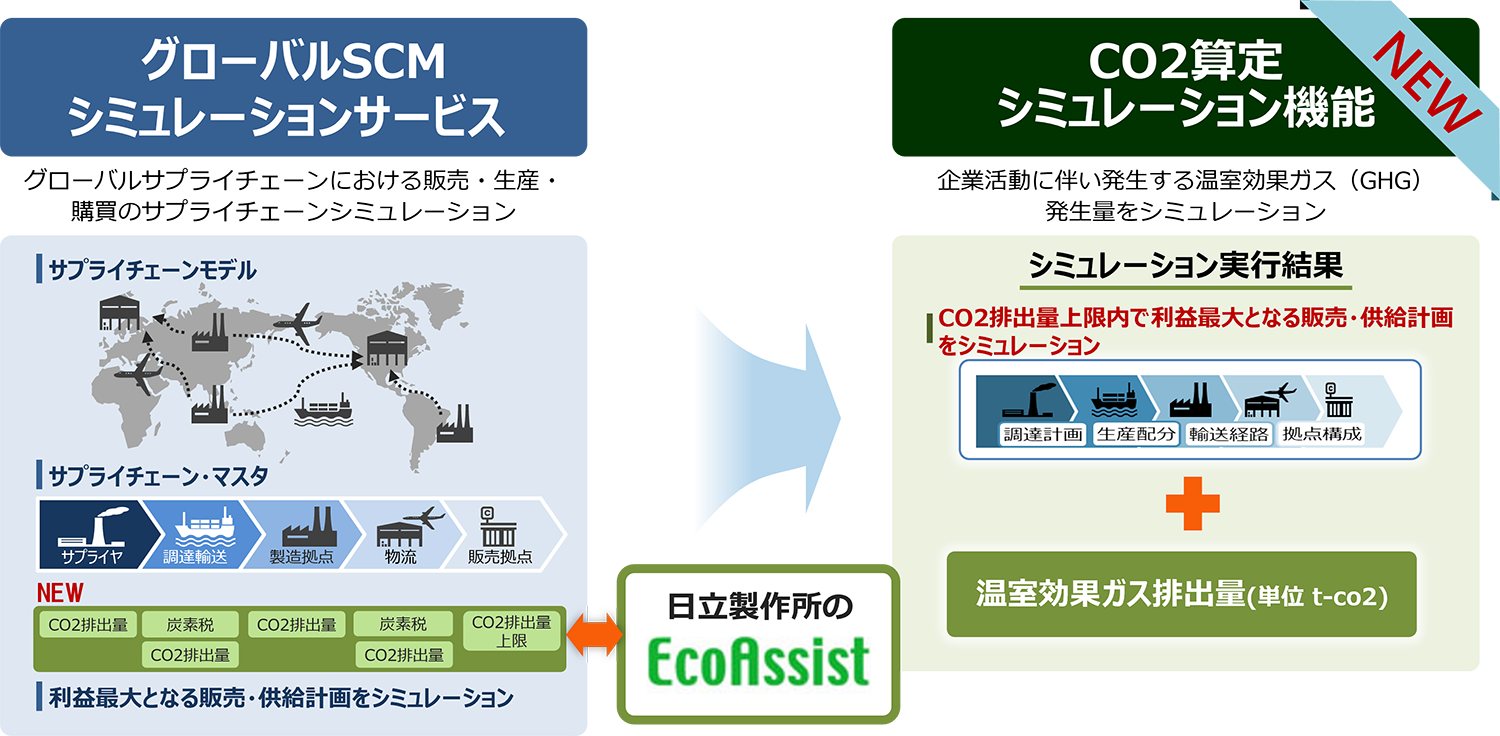 「グローバルSCMシミュレーションサービス」に実績データをマスターとして設定することで、1製品や部品あたりのサプライチェーンに関わるCO2排出量を試算することができます。 実績データとしては、日立製作所の環境情報管理サービス「EcoAssist-Enterprise-Light」と連携することで、原材料や輸送、生産、工場全体のサプライチェーンに関わるCO2排出量の実績を一元管理できるようになります。