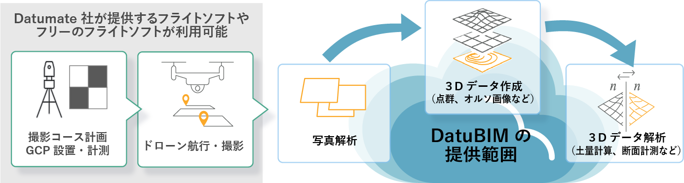 本サービスは、撮影画像からダチュメイト社独自のAI(人工知能)技術で3次元データを自動生成します。データを時系列で管理し、地形の断面や盛土体積などの計測、設計図面との比較分析も行うことで、工事の進捗管理の効率向上を支援します。現場のニーズの高いCADデータの取り込みにも対応します。