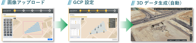 ドローンで撮影した土木工事現場の撮影画像をクラウド上にアップロードし、3次元化する対象範囲を指定して、マーカー(標定点、検証点)を設定すると、独自のAIアルゴリズムが、高速に3次元データ(3D点群/3Dメッシュモデル/オルソ画像など)を自動生成します。重なりのある複数視点からの画像を用いて3Dモデルを生成するため、撮影画像の重複(オーバーラップ)の過不足に対してアラートが表示されます。また、目的の場所にマーカーで位置の指定を行う際はガイドが表示されるため、初心者でもWebブラウザ上で簡単に操作することができます。
