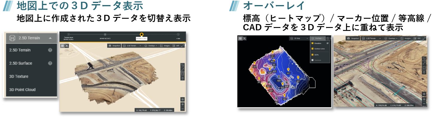 撮影映像から地形、盛土の計測やデータ管理・共有をクラウド上で行い、現場のデジタル化を促進