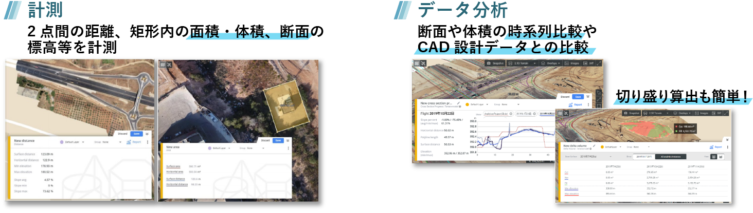 工事の進捗管理や土量配分計画のために必要な日々の測量は、ドローンを活用することで、3次元データとして時系列に管理することができます。従来の人手による測量手法と比べて作業日数やコストを削減することが可能です。また、過去のデータや設計図面との比較、体積や断面などの計測、土量の切り盛り計算も容易です。設計データとの差を管理することで、手戻りを防ぎ、コストを低減することもできます。