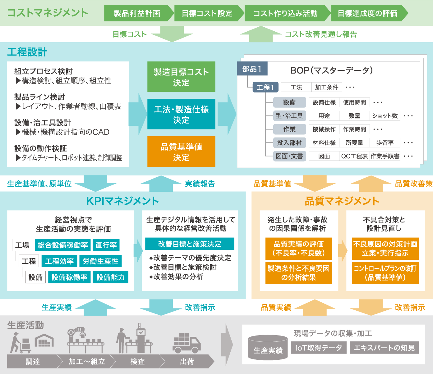 生産準備データを統合管理し、開発・生産準備期間の短縮や適正品質の作り込み、コスト競争力の強化を達成