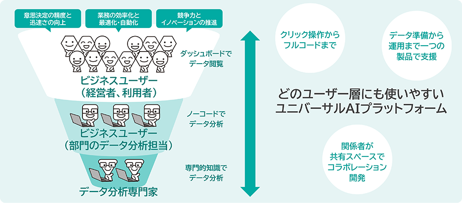 経営者や営業、事業部門などのビジネスユーザーからデータ分析専門家まで、幅広い層のデータ分析とAI活用を促進