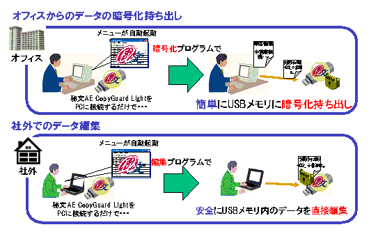これらの問題を解決すべく開発された「秘文AE CG Light」は、USBメモリでOffice文書を利 用する際に、暗号化をして保存することにより、USBメモリの紛失による情報漏洩を防止致しま す。さらに、「秘文AE CG Light」により、USBメモリ内に保存した暗号化ファイルは、 USBメモリ上にのみ保存するよう制御しているため、社外PCなどにコピーされることはありま せん。よって社外PCからのウィルスなどによる情報漏洩を防止します。本製品はソフトウェア のインストールは不要で、USBメモリをPCに接続するだけですぐにご利用になれます。