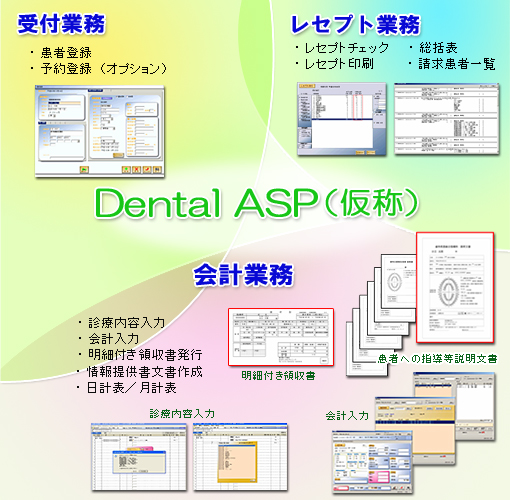 「DentalASP(仮称)」は、患者登録機能を始め、セット項目から簡単に入力ができるカルテイメージの診療内容入力機能、容易に会計業務ができることを考慮した会計待ち表示機能、レセプト業務に必須であるレセプトチェック機能、予約管理機能等、多彩な機能を搭載しており、医師・スタッフの作業効率を向上させます。また、平成18年4月の診療報酬改正に対応した明細付き領収証発行、各種情報提供書文書の作成機能を標準で装備しています。