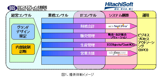 日立ソフト(本社:東京都品川区、代表執行役 執行役社長:小野 功)と株式会社ビジネスブレイン太田昭和(本社:東京都千代田区、代表取締役社長 木村 幸弘、以下BBS)は、資本・業務提携により、経営コンサルテーションからシステム運用までを日立ソフトグループで一貫対応し、顧客の収益拡大など経営上の価値向上に貢献できる体制を確立してきました。その第一弾として、本年2月から内部統制支援コンサルテーションサービスの展開に取り組んでおり、グループ全体で30件以上の案件を受注し、うち5件に関しては両社でサービスを提供するなど、成果をあげることができました。 しかしながら、経営上の価値向上を顧客に提供するには、内部統制のみならず、業務再構築(BPR)を含めた具体的なITシステムの提供も必要となります。その為、第二弾として、まず急務と思われる上場前後の伸び盛りの企業群約500社に対して、内部統制を含む経営コンサルテーションにより抽出したビジネス上の課題をIT基盤によって解決し、顧客の利益増加に直接的に貢献する「業務改革ソリューション」の提供を開始しました。本ソリューションでは、BBSが業務の可視化及び課題の抽出とそれに基づく経営戦略の提示を担当し、日立ソフトが提示された経営戦略に基づくIT基盤の構築を、予め用意したソリューションセットを中心に行います。これまで4案件の共同受注を達成し、今後も大幅な伸びを期待していま す。