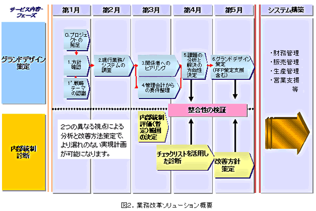内部統制支援コンサルティングでは、(1)リスクコントロールマトリクス作成、(2)業務フローの作成、(3)業務記述書の作成により、監査への対応、業務フローの明確化、業務上の課題を抽出することができました。しかし、BBSの今までのコンサルティング経験から、上場前後の伸び盛りの企業では、内部統制と共に急速な業容の拡大を支えるIT基盤構築へのニーズが高いことが明確になってきています。そこで、BBSと柔軟性・信頼性を兼ね備えたIT基盤の構築実績を誇る日立ソフトが双方の強みを生かした業務改革ソリューションの提供を開始しました。