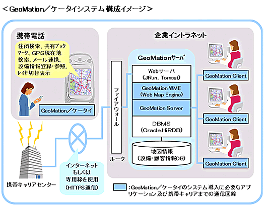 GIS(地理情報システム)で管理・運用される業務データはこれまで社内LAN等の限られた環境でしか参照できませんでした。今回のGIS商品「GeoMation(ジオメーション)/ケータイ」は、携帯電話から参照・更新しますが、業務データをセキュアに取り扱うことが可能です。
