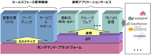 (*1) 「Apex」は、データ管理オブジェクト、ワークフローエンジン、ユーザインターフェースの生成、インテグレーション用のWebサービスAPIなど、ビジネスアプリケーション作成に必要とされる機能を提供します。「Apex」を用いて開発されたアプリケーションは、セールスフォース・ドットコムのサービス上で動作します。