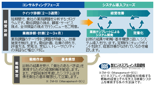 「Fit-ONE」の最大の特長は、コンサルティング+業務テンプレートの組み合わせです。Fit-ONE導入の最初にコンサルティングフェーズを設け、現状の業務整理、課題の明確化をした後システム導入に進むため、高い投資対効果が期待できます。このコンサルティングフェーズはBBSより提供します。
