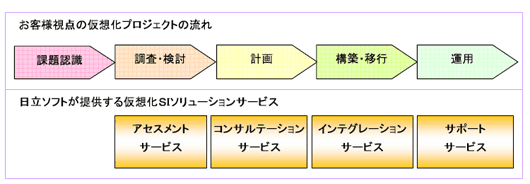 こうした背景の中、日立ソフトでは、数多くのサーバ統合SI案件の実績や本年1月からサービスを開始した仮想化技術を適用した「Secure Online 統制IT基盤提供サービス(注1)」のノウハウを活かした「仮想化SIソリューション」を提供いたします。「仮想化SIソリューション」では、お客様の課題を解決するため、川上から川下まで一貫した4つのサービスを提供いたします。 (注1)Secure Online 統制IT基盤提供サービス:仮想マシン、OS、各種ミドルウェア、各種ツールからなる開発IT基盤を、必要な時に必要なだけ購入して利用できるオンデマンド型の提供サービス。