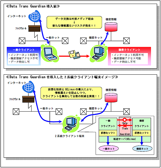 当社では、Data Trans Guardianを搭載した機密用と一般用の2つの環境を持つPC「2系統クライアント端末」を、官公庁や金融・証券業等の機密性の非常に高い情報を扱うお客様を対象に提供してまいります。